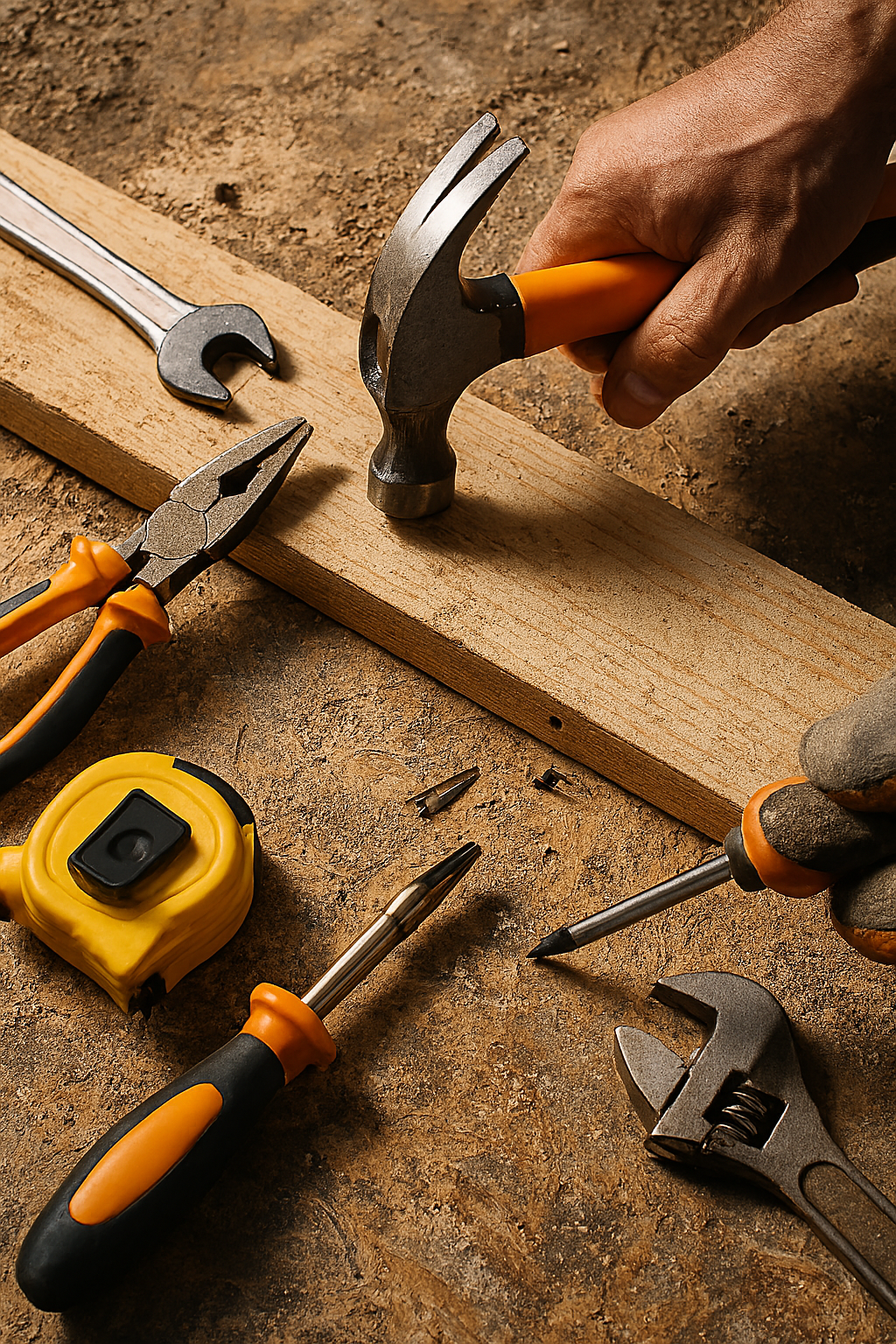 Essential woodworking tools—screwdrivers, pliers, and wood shavings—capturing the spirit of hands-on craftsmanship.Perfect for showcasing DIY products, construction gear, or catalog features with a practical, authentic touch.