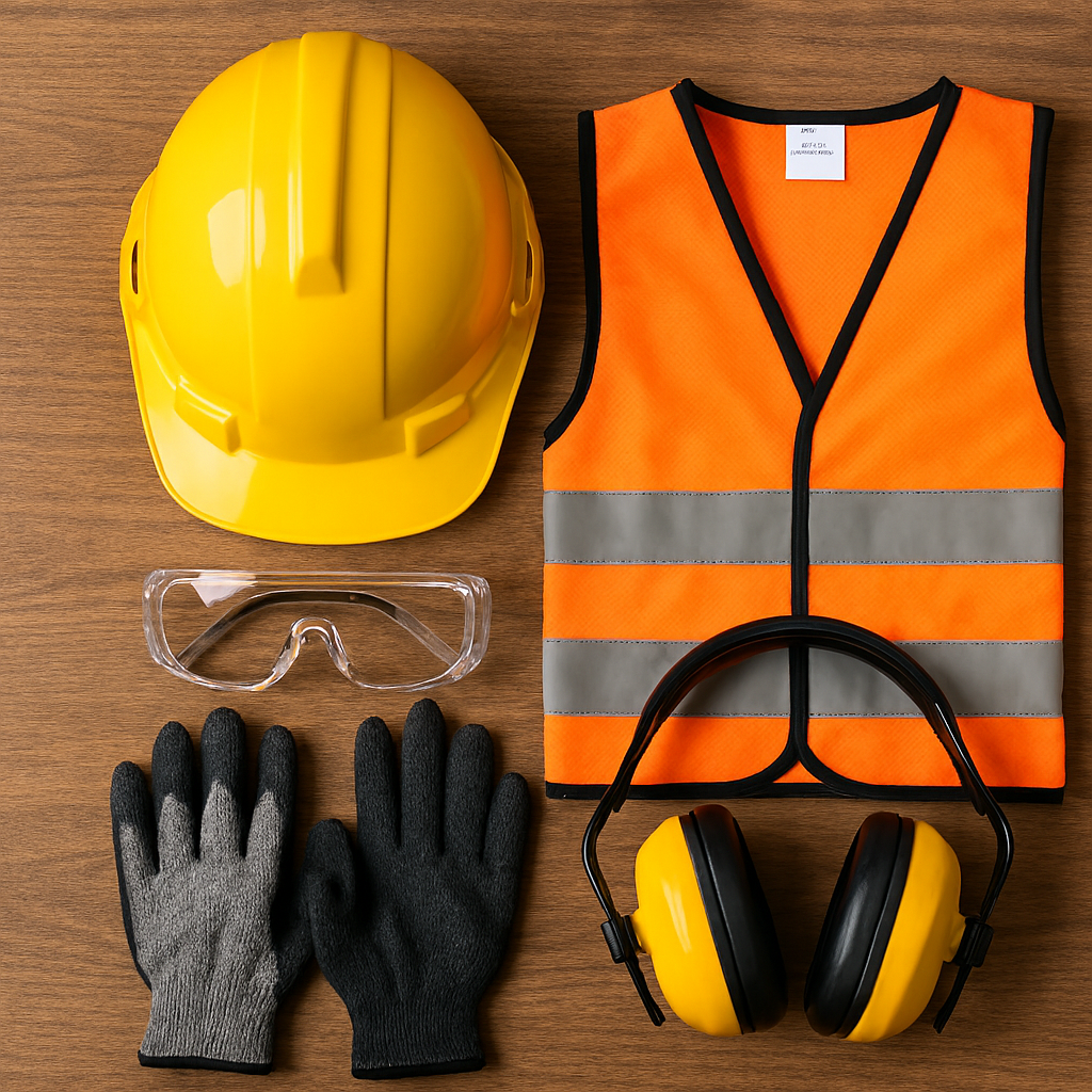 Display of essential personal protective equipment—hard hat, goggles, vest, earmuffs, and gloves.